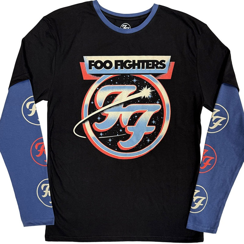 An official licensed Foo Fighters Layered Long Sleeve T-Shirt featuring the Comet design motif. Layered sleeve detailing with contrasting collar. Soft-style cotton. Front & sleeve print.