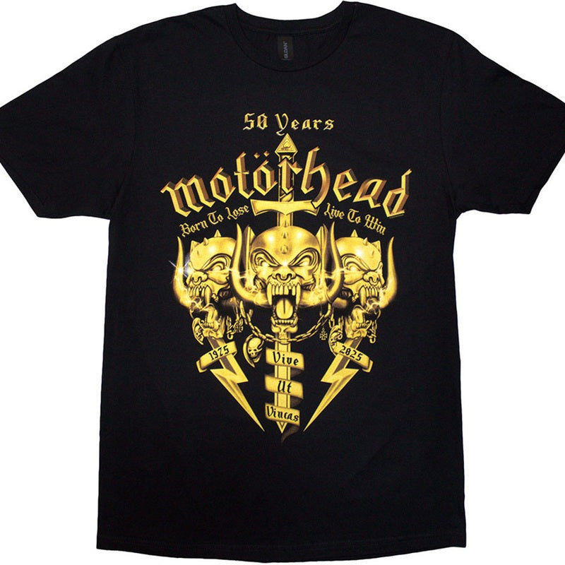 An official licensed Motorhead T-Shirt featuring the 50 Years Swords & Warpig design motif. Soft-style cotton, Front print only